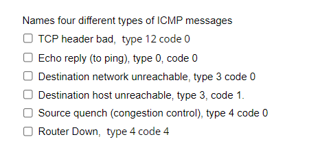 The ICMP message contains the following fields. Who are the experts. Name four different types of ICMP messages.